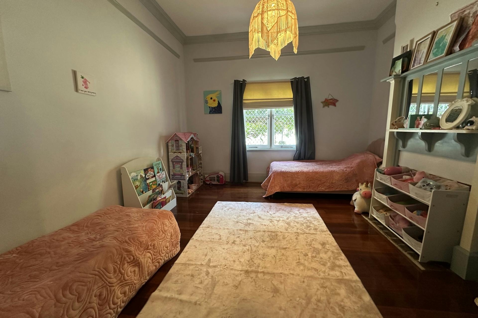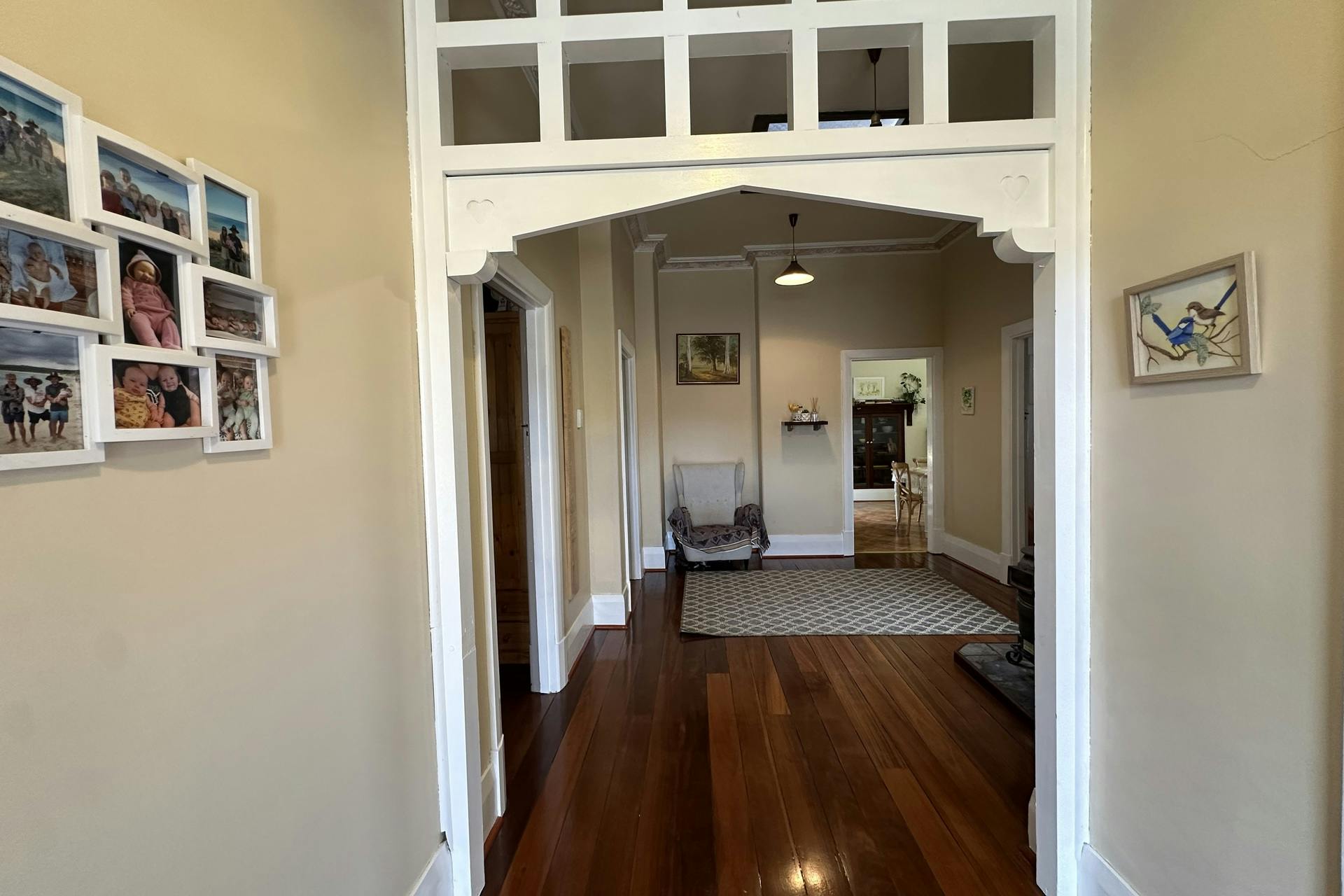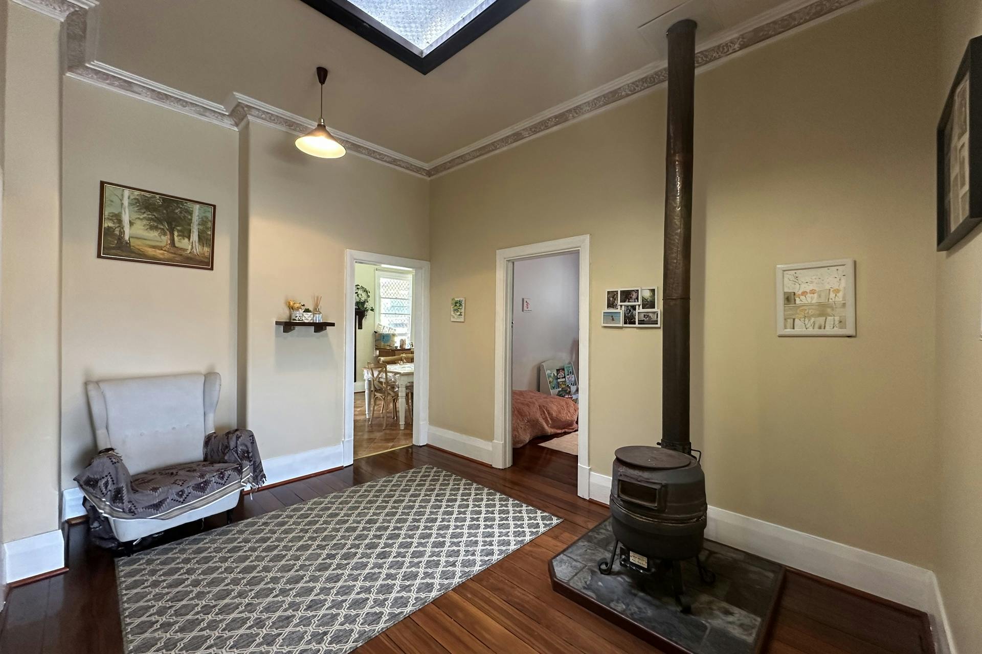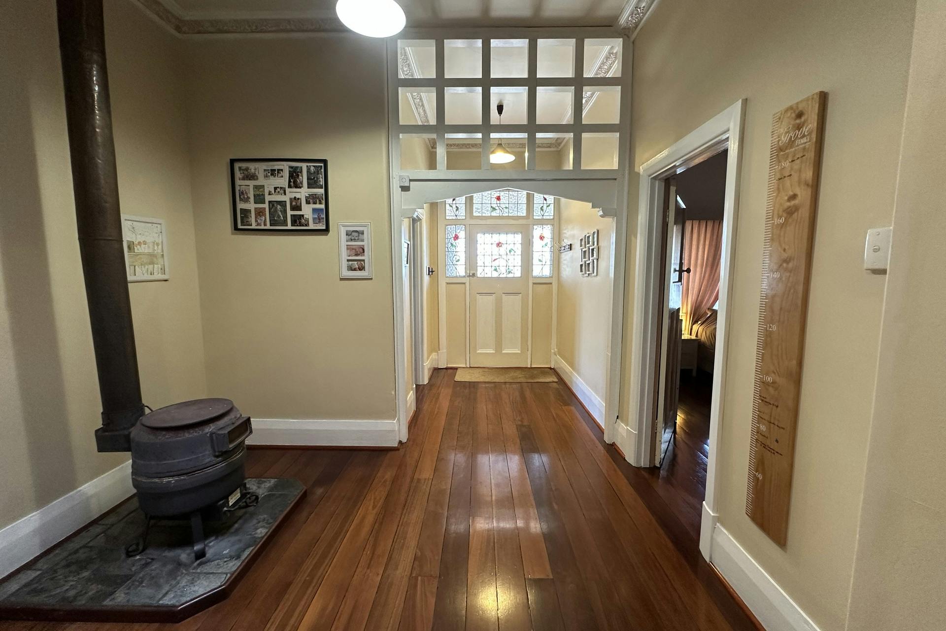 Inside, the home continues to delight with its classic features, including high ceilings, polished hardwood floors, stunning leadlight windows in the entryway, and ornate cornicing and ceiling roses. A wide, welcoming foyer sets the tone, complete with a cosy pot-belly fireplace capable of heating the main bedrooms during cooler winter evenings.