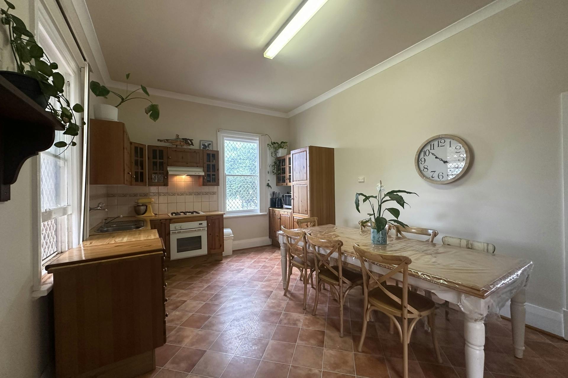 Outdoors, the expansive backyard provides excellent space for entertaining, featuring a covered patio, fenced vegetable garden, wood shed and garden shed. The kitchen is both practical and charming, complete with a built-in display cabinet and rainwater plumbed directly from the tank.